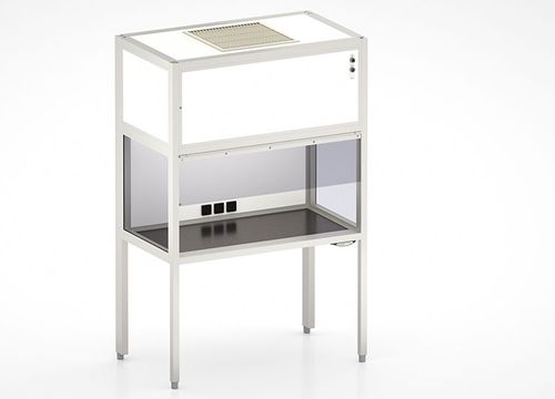 EX-01496Supporting versatile use of space with a work bench in a custom size, this laminar flow box for clean production protects the work process in one section of the bench. The hood complete with Filter Fan Unit can be configured as a table-top unit that is only used when necessary. Just like the work access opening, it can be adapted precisely to the production process.